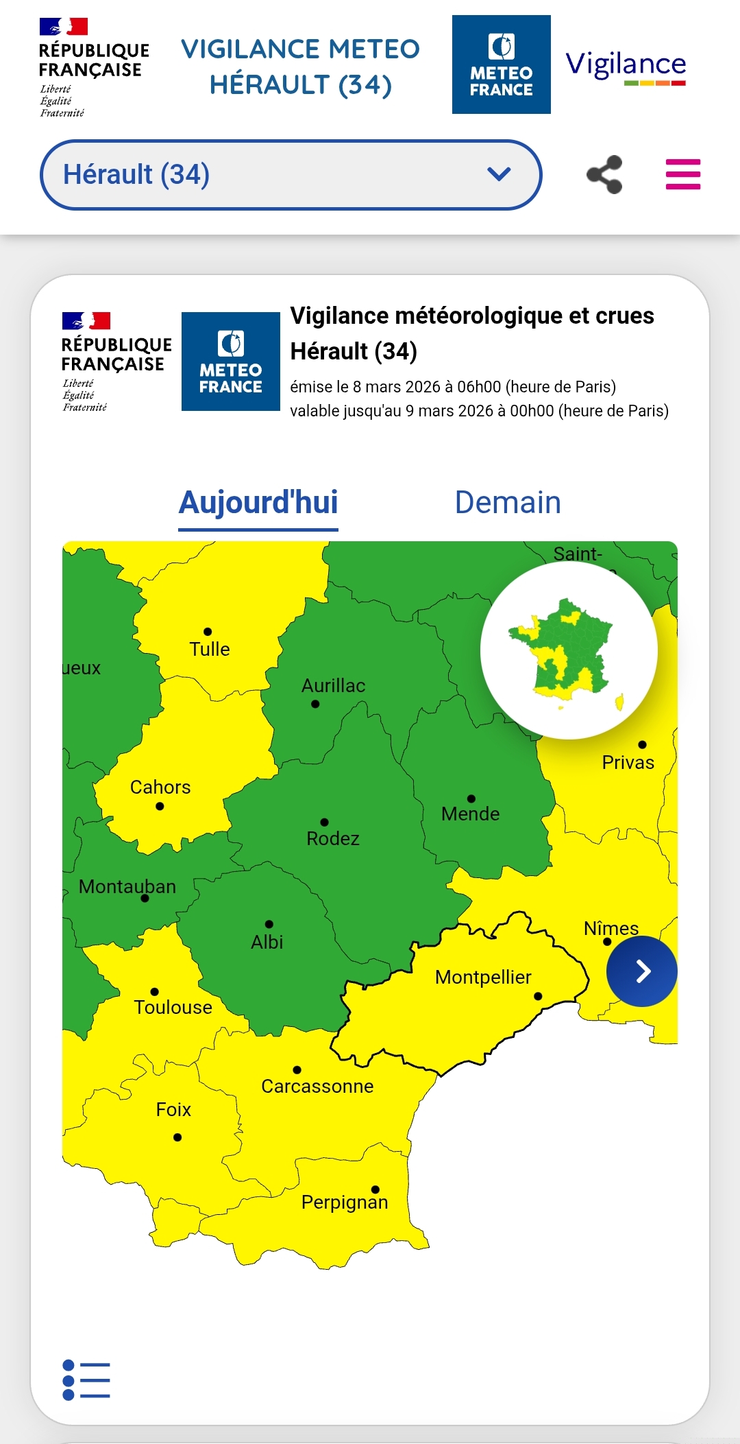 Crédit photo : https://vigilance.meteofrance.fr/fr/herault/demain